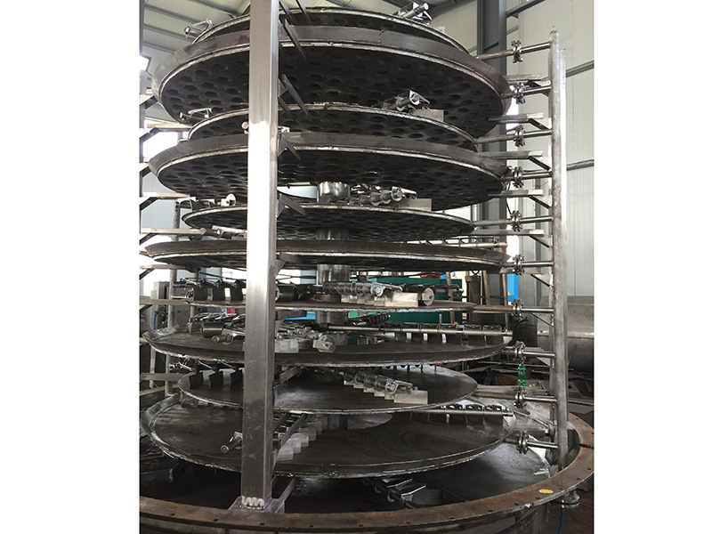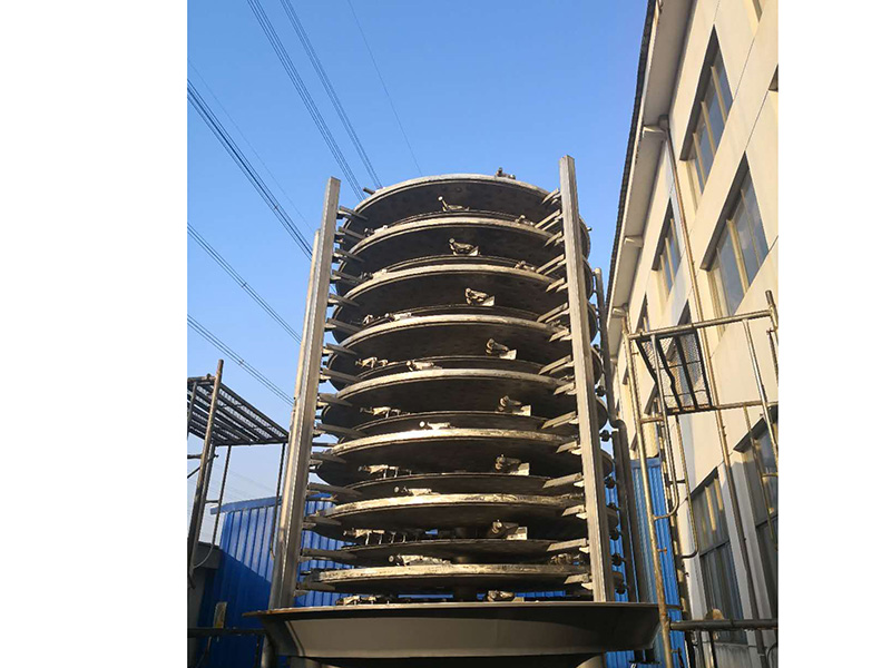 湿物料自加料器连续地加到干燥器上部层干燥盘上,带有耙叶的耙臂作回转运动使耙臂作回转运动使耙叶连续地翻抄物料。物料沿指数螺旋线流过干燥盘表面,在小干燥盘上的物料被移送到外缘,并在外缘落到下方的大干燥盘外缘,在大干盘上物料向里移动并从中间落料口落如下一层小干燥盘中。大小干燥盘上下交替排列,物料得以连续地流过整个干燥器。中空的干燥盘内通入加热介质,加热介质形式有饱和蒸汽、热水和导热油,加热介质由干燥盘的一端进入,从另一端导出。已干物料从后一层干燥盘落到壳体的底层,后被耙叶移送到出料口排出。湿份从物料中逸出,由设在顶盖上的排湿口排出,真空型盘式干燥器的湿气由设在顶盖上的真空泵口排出。从底层排出的干物料可直接包装。通过配加翅片加热器、溶剂回收冷凝器、袋式除尘器、干料返混机构、引风机等辅机,可提高其干燥的生产能力,干燥膏糊状和热敏性物 料,可方便地回收溶剂,并能进行热解和反应操作。