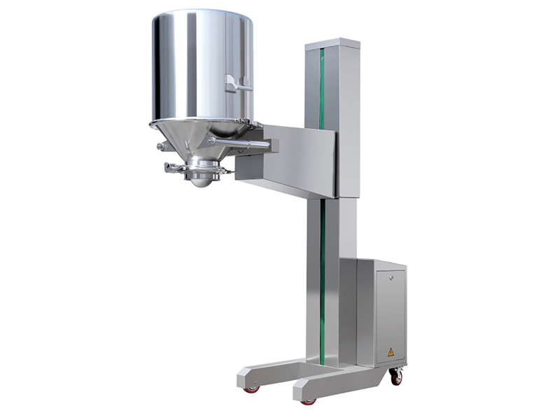 该机主要由底盘小车、伸缩系统、提升系统、翻转系统等组成。工作时,先将锥斗与料桶扣合,然后启动提升按钮,料桶提升;启动翻转按钮,料桶即可翻转180° 移动底盘小车与加料的设备密闭对接,开启出料蝶阀,使物料密闭转移到下一工序。