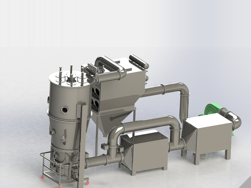 开启循环风机,使物料沸腾状态良好;开启散热器将系统内温度加热到需要温度,热量经氮气传递带走物料中的水分及有机溶剂,并带走少量的微粉;系统中,微粉经除尘器(过滤至 2-5μm)收集,湿热气体经冷凝器将溶媒及有机溶剂冷凝成液态并经储液箱收集;经冷凝除湿后的干燥氮气经风机作用在系统内循环使用。