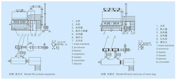 沸腾干燥,又称流化床,它是由空气过滤器、加热器、沸腾床主机、旋风分离器、布袋除尘器、高压离心风机、操作台组成,由于干燥物料的性质不同,配套除尘设备时,可按需要考虑,可同时选择旋风分离器、布袋除尘器,也可选择其中一种,一般来说比重较大的如冲剂及颗粒物料干燥只需选择旋风分离器,比重较轻的小颗粒状和粉状物料需配套布袋除尘器,并备有气力送料装置及皮带输送机供选择。